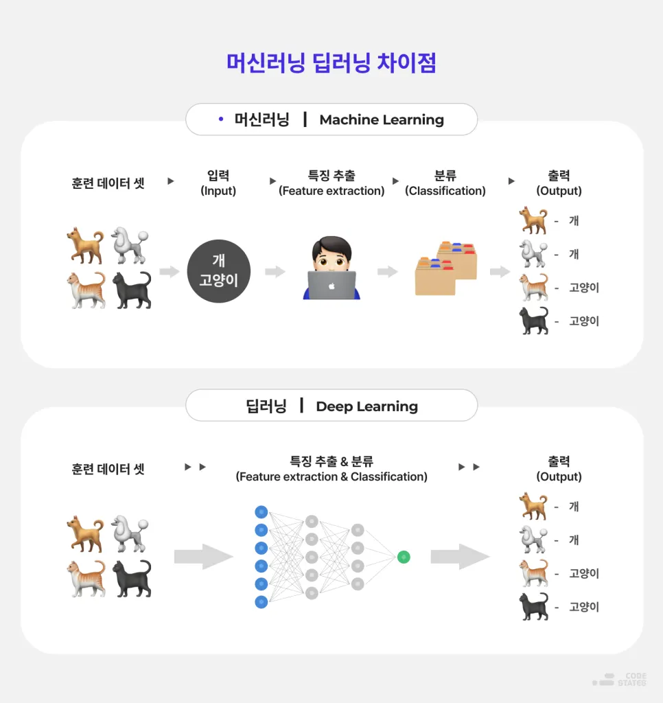 2. ์ปดํจํฐ๊ฐ ๋ฐ์ดํฐ๋ฅผ ํ์ต (์ฌ๋์ด ์ง์ํ ํจํด์ ๊ธฐ๋ฐํด์ ์ปดํจํฐ๊ฐ ์ค์ค๋ก ๋ฐ์ดํฐ์ ํน์ง์ ๋ถ์ํ๊ณ ์ถ์ ) | 1. ์ปดํจํฐ๊ฐ ์ ํด์ง ์ ๊ฒฝ๋ง์ ๊ธฐ๋ฐ์ผ๋ก ์ค์ค๋ก ํน์ง ์ถ์ถยท๋ถ๋ฅ ์์