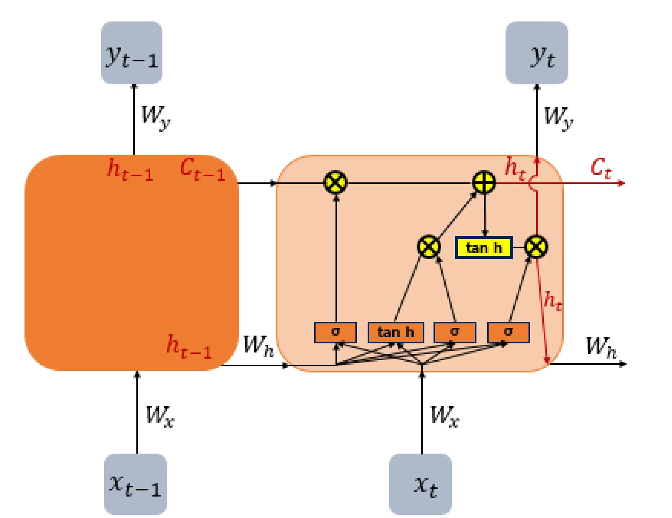 ์ถ๋ ฅ ๊ฒ์ดํธ์ ๋ง๊ฐ ๊ฒ์ดํธ๋ฅผ ์ถ๊ฐํ์ฌ ๊ธฐ์ต์ ๋ํ ์ฐ์ฐ์ ๊ฐ์ ํ์ฌ RNN์ ๋จ์ ์ ๊ฐ์ ํ ๋ชจ๋ธ.