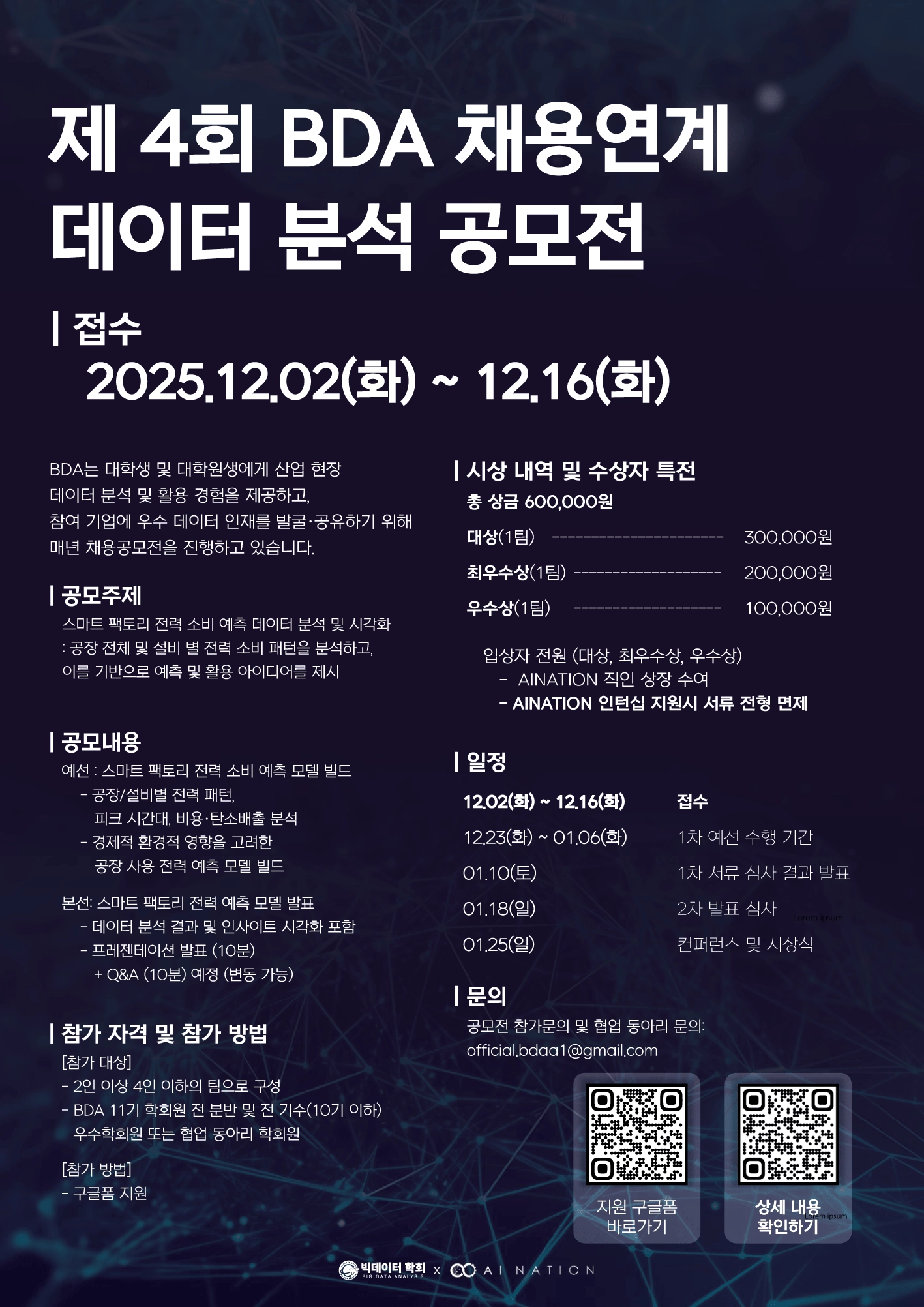 지난 학기에는 BDAI Network 참여 학회로서 AINATION x BDA 채용 연계 데이터 분석 공모전을 통해 산학 협력을 진행하였습니다.